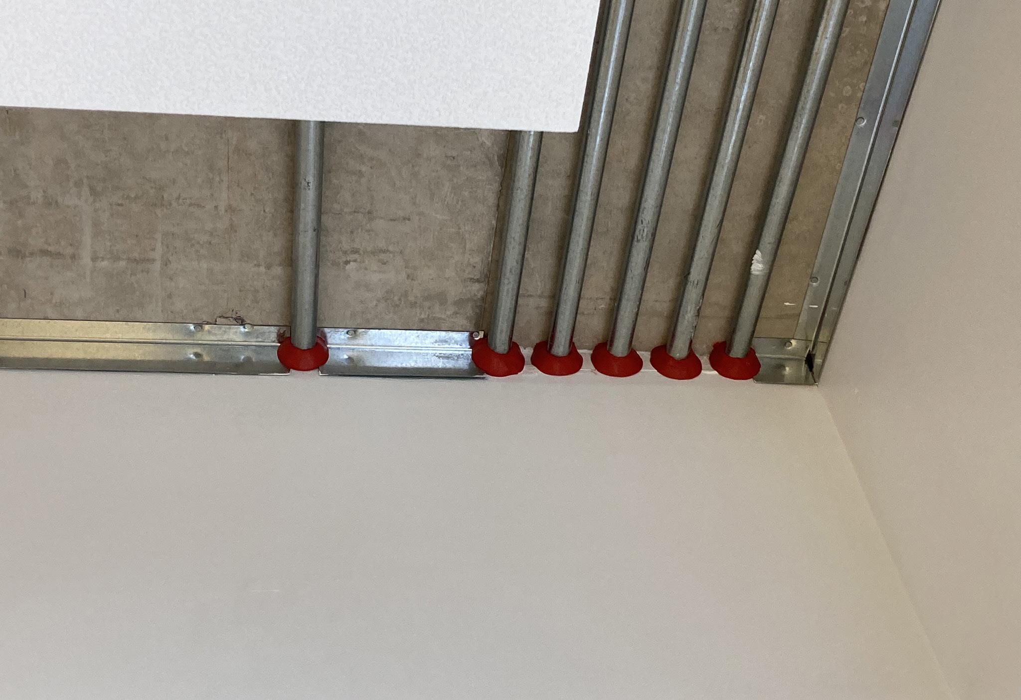 4 gas pipe services hidden behind acoustic panels and packed out wall
