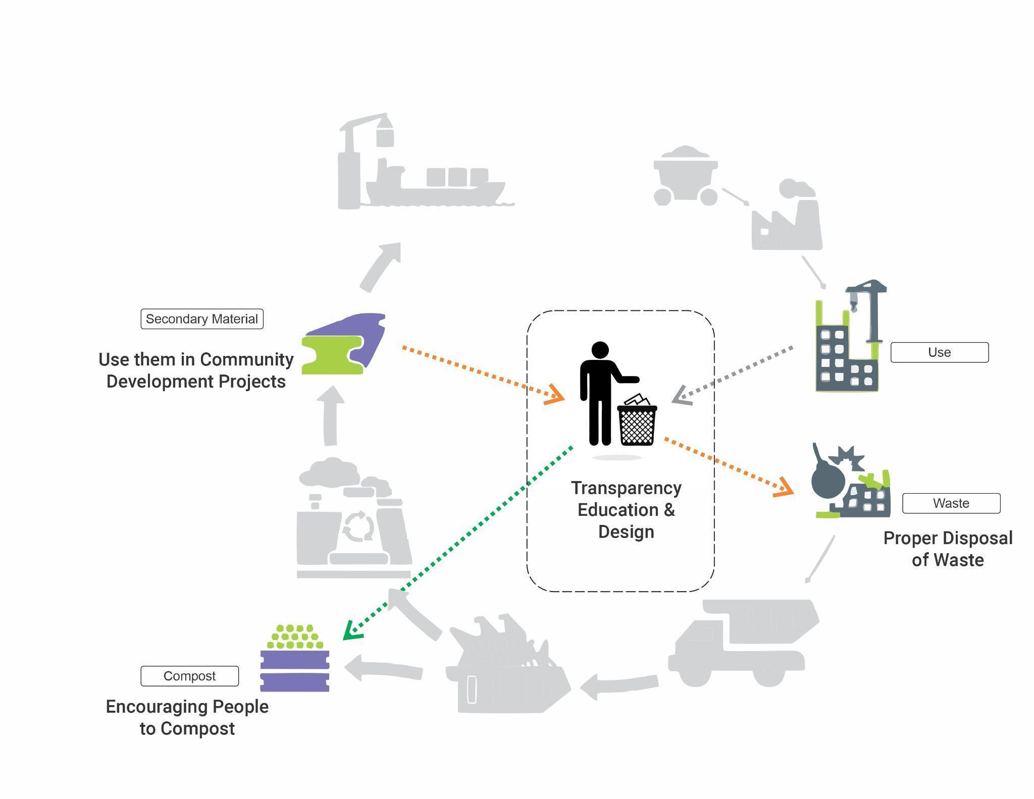 We propose community engagement to add residential, block, and community-based sorting levels to build a better system. And there will be community composting and recycling center as well.