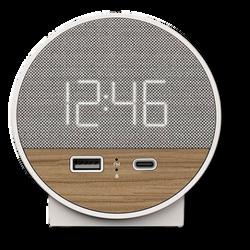 This design-forward alarm clock features dual front-facing USB-C and USB-A universal charging ports, with a sleek and spherical aesthetic Easy to use and effi - ciently-sized, this alarm clock is available in JetWay Black, Char- coalWeave, and WalnutWeave.