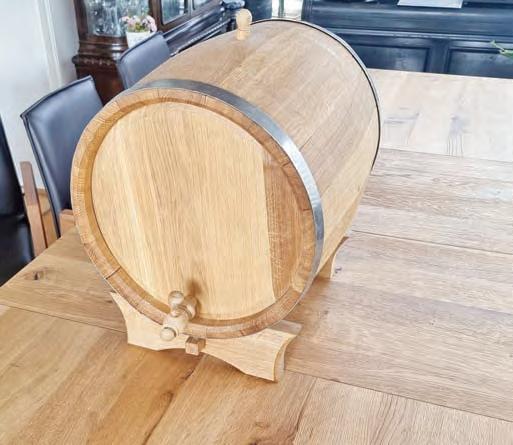 von selbst ab. Der Fassring ist aus hochwertigem Edelstahl gefertigt, der Standfuß ist nach handwerklichen Wünschen mittels Zapfen verkeilt und wurde individuell angefertigt. Der hölzerne Zapfhahn ist ein zusätzlicher Hingucker und ist ebenfalls vollumfänglich zu nutzen.