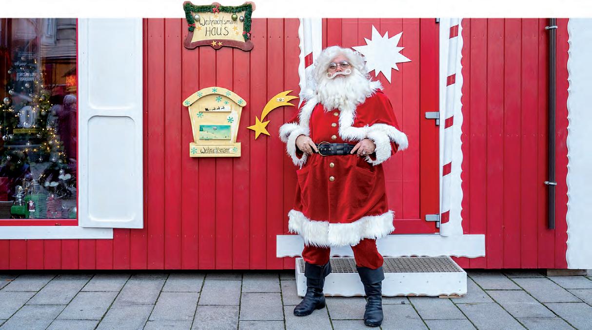 reist ist er mit seinem Schlitten einen Tag vor der Eröffnung des Weihnachtsmarktes. Durch die Lüfte, da das Risiko durch an Wolken festgeklebte Klima-Aktivisten ungleich geringer war als über die Straßen. Er wollte ja pünktlich einen Tag vor der Eröffnung im Rathaus ankommen. Dort habe er dann übernachtet und am Tag der Eröffnung haben ihn die Kinder geweckt und aus dem Rathaus gerufen. Nun ist er bis einen Tag vor dem Heiligen Abend täglich von 14 bis 18 Uhr in seiner Weihnachtsmannhütte anzutreffen. Dort sitzt er, guckt, zwirbelt seinen Bart, winkt den Kindern, öffnet und sortiert natürlich auch seine Post, die Kinder ihm in den außen angebrachten Briefkasten stecken können. Und was irgendwie in seiner Macht liegt, diese Wünsche wird er natürlich erfüllen. Da es aber so viele Wünsche sind und er das allein gar nicht schafft, hat er natürlich noch viele Helfer, die in seinem Auftrag unterwegs sind. So helfen ihm die Engel, ein paar Weihnachtsmanngehilfen und auch der Glaube und die Hoffnung sind ihm stets zur Seite bei der Erfüllung der zahlreichen Wünsche.