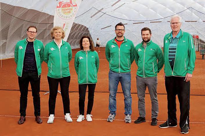 Der Vorstand des 1. TC Magdeburg bei der Eröffnung der Traglufthalle im März 2022 (v. l.): Vorstandsvorsitzender Sören Brauns, Schatzmeisterin Renate Quast, Verantwortlich für Presse- und Öffentlichkeitsarbeit Christiane Hapke, Sportwart Matthias Hoberg, Jugendwart Fabio Antemann, 2. Vereinsvorsitzender Jürgen Hoberg. Fotos (2): Verein