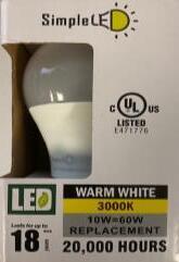 NON-DIMMABLEA19 LED 4-PACKS 9W=60W2700K800LUMENS S39596 9W=60W5000K800LUMENS S39597 11W=75W2700K1150LUMENS S28769 11W=75W5000K1150LUMENS S28770