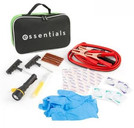 This Auto Safety Kit from Essentials contains essentials for automotive safety, all in one convenient carrying case (with Velcro strip to secure it in the trunk). The kit includes 8 foot 10-gauge booster cables, durable rubber grip LED flashlight with ON/OFF switch, (2) heavy duty AA batteries, (1) pair of nitrile gloves (not for medical use), tire repair reamer with (5) plugs, and an emergency glow light stick. It also contains essential first aid items, including: (18) bandage strips, (3) alcohol prep pads, and (3) BZK antiseptic towelettes. .