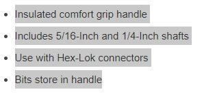 INCLUDES 1/4– INCH, 5/16-INCH, 11/32-INCH, 7/16-INCH, AND 1/2-INCH NUT DRIVER SIZES