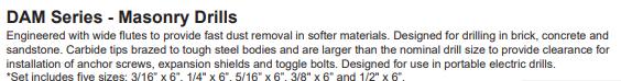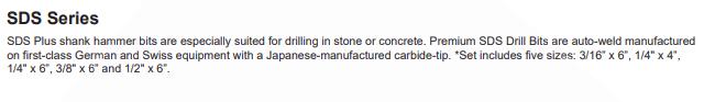 ITEM PACKED LIST PRICE DWDGD1/8 1 $3.95 DWDGD3/16 1 $4.07 DWDGD1/4 1 $4.86 DWDGD5/16 1 $4.95 DWDGD3/8 1 $8.57 DWDGD1/2 1 $10.58 ITEM (COLUMN 1) PACKED LIST PRICE ITEM (COLUMN 2) PACKED LIST PRICE SDS110 1” X 10” 1 $20.54 SDS3812 3/8” X 12” 1 $6.27 SDS1212 1/2” X 12” 1 $8.26 SDS3818 3/8” X 18” 1 $10.83 SDS1218 1/2” X 18” 1 $11.82 SDS386 3/8” X 6” 1 $3.51 SDS126 1/2” X 6” 1 $5.11 SDS5166 5/16” X 6” 1 $3.20 SDS144 1/4” X 4” 1 $2.70 SDS5325 5/32” X 5 1/2” 1 $6.90 SDS146 1/4” X 6” 1 $3.09 SDS5326 5/32” X 6” 1 $4.49 SDS3164 3/16” X 4” 1 $2.75 SDS5327 5/32” X 7” 1 $6.90 SDS3165 3/16” X 5 1/2” 1 $6.90 SDS5812 5/8” X 12” 1 $12.30 SDS3166 3/16” X 6” 1 $3.13 SDS5818 5/8” X 18” 1 $14.16 SDS3167 3/16” X 7” 1 $7.61 SDS588 5/8” X 8” 1 $7.10 SDS3412 3/4” X 12” 1 $16.20 SDS7166 7/16” X 6” 1 $4.19 SDS3418 3/4” X 18” 1 $22.40 SDS7810 7/8” X 10” 1 $17.79 SDS348 3/4” X 8” 1 $14.98 SDS9756 9/16” X 6” 1 $