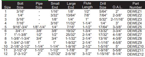133 EZ OUT/SCREW EXTRACTORS ITEM (COLUMN 1) PACKED LIST PRICE ITEM (COLUMN 2) PACKED LIST PRICE DEWEZ1 1 $1.07 DEWEZ7 1 $6.60 DEWEZ2 1 $1.22 DEWEZ8 1 $9.00 DEWEZ3 1 $1.41 DEWEZ9 1 $15.70 DEWEZ4 1 $1.47 DEWEZ10 1 $23.15 DEWEZ5 1 $1.84 DEWEZ11 1 $34.65 DEWEZ6 1 $4.10 DEWEZ12 1 $56.25