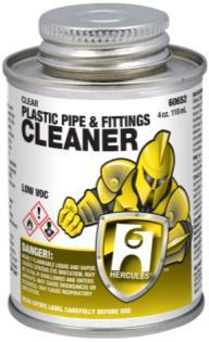 Removes surface dirt, oils and other contaminants from piping Hercules® Pipe & Fittings Cleaner • Fast acting cleaner for ABS, PVC & CPVC • Clear in color, will not stain most surfaces • Removes surface dirt, oils and other contaminants from piping Part No. Size: Case Pack: Price/ea 30780 4 Oz. 24 $4.29 Part No. Size: Case Pack: Price/ea 60652 4 Oz. 24 $4.40 R1583C R1584C 127