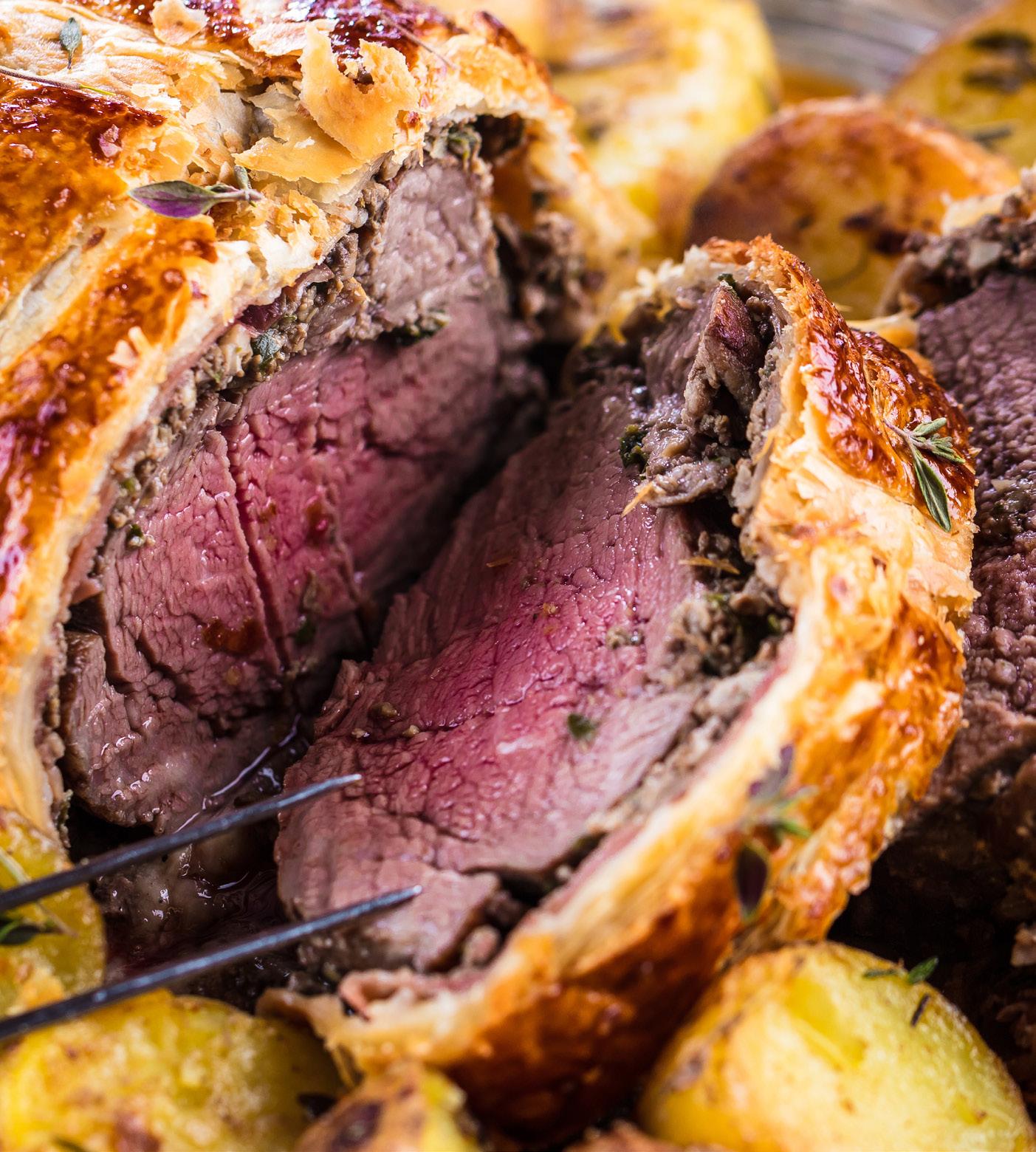 Rinderfilet Wellington auf Rotweinschalotten und Junggemüse