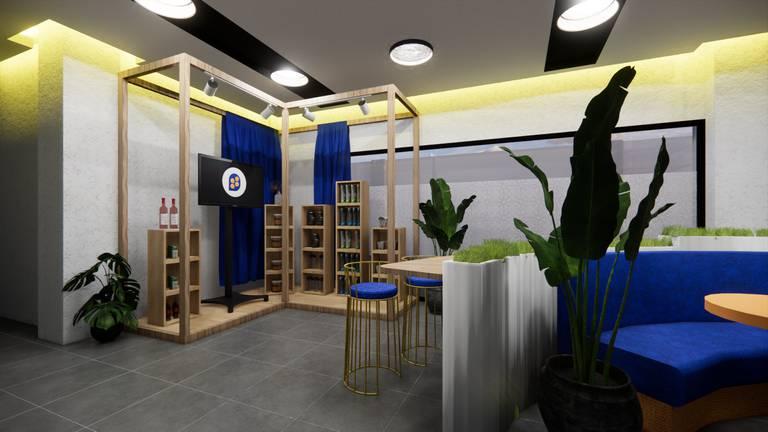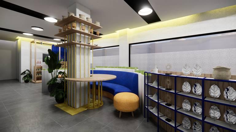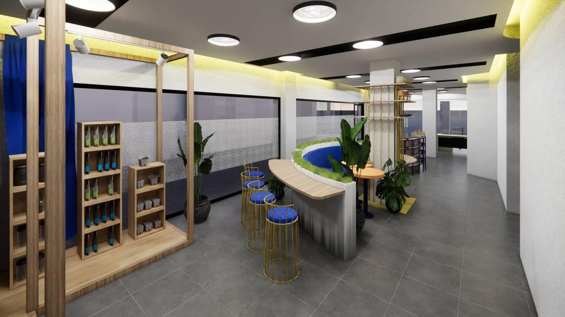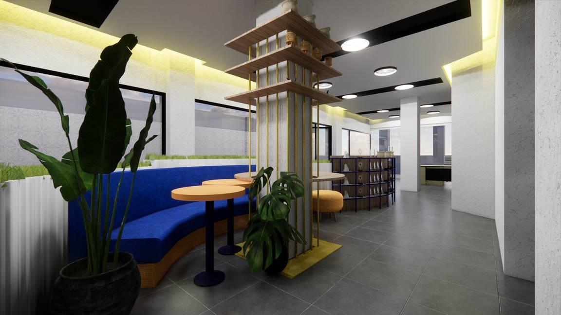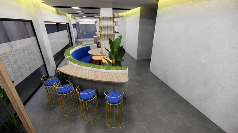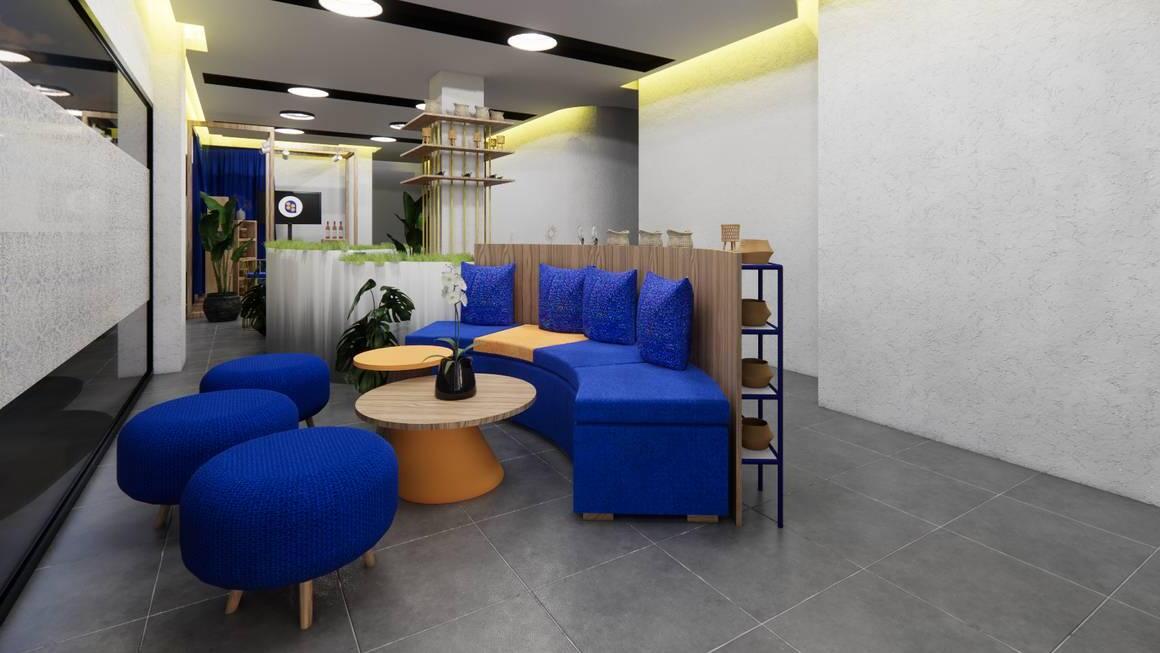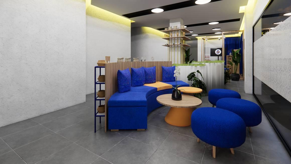 Desain interior pada lobby gedung shopee sembrani. Gedung shopee sembrani merupakan inkubator yang mewadahi para UMKM dan perusahaan yang baru merintis (Start Up). Interior yang berkonsep UMKM dan Start Up dengan menyediakan satu set sofa untuk area tunggu, 2 area working space, dan beberapa display untuk produk UMKM berupa kerajinan tangan atau makanan dan minuman. TV untuk promosi start up digital yang ada. Warna biru dan orange yang merupakan special request dari client terinspirasi dari warna logo program Solo Techno incubator. DIakhir membuatrabinterior.