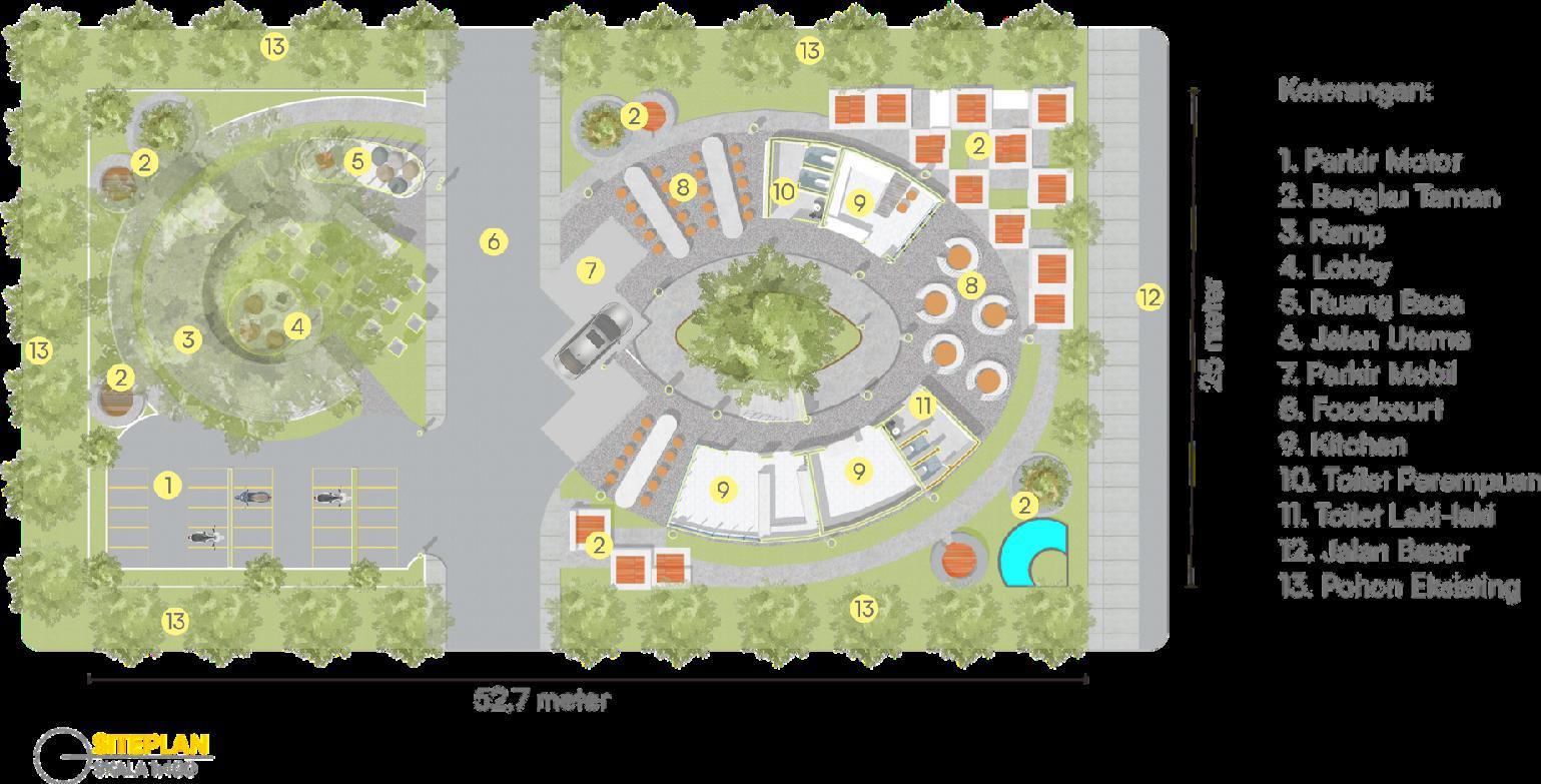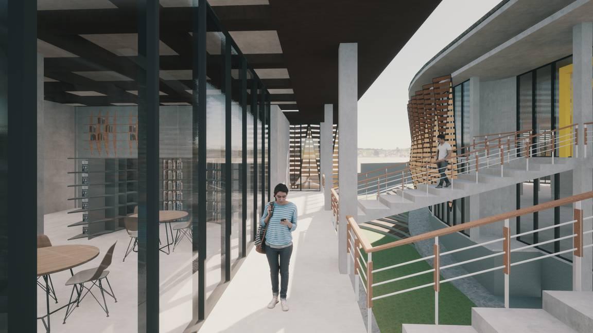Bangunan memiliki konsep yang berfokus pada pelayanan terhadap pengunjung atraktif yang mayoritas dari Gen Z. maupun pengelola dan koleksi buku yang ada dalam bangunan. Perpustakaan memiliki fitur productive area yang menargetkan pegunjung Gen Z, best service dengan perfoma yang mendukung, biophilic design yang menunjang lingkungan yangramahdanmembantukreativitaspengunjung.