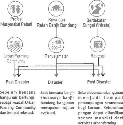 Shelter sebagai bangunan “bersiklus dan multifungsi”. Rangkaian aktivitas dihasilkan dari masa post, Disaster dan past, dimana fungsi dari shelter akan menyesuaikan massa siklus. Bangunan sebagai bangunan evakuasi dan penampungan yang dapat menghasilkan sumber pangan secara mandiri di samping bangunan ini juga menunjang farming community dan rekreasi. Untuk misi penyelamatan makrodidaerahhantakanmakashelterdapatdisebarketitik-titikrawanbanjir.