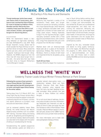 reer in South Africa before settling down in Switzerland with his Norwegian wife Kari, a singer and instrumentalist. He has worked for 35 years as a professional singer-songwriter, and when he’s not running the restaurant, McCarthy can be found playing music at the Golf Hotel Saanenmöser and Grand Chalet, amongst other hotels. If time permits, he brings his guitar downstairs and the couple serenade guests between bites of McCarthy’s contemporary cuisine. Inspired by the airy, renovated locale and desire to bring quality hamburgers to the region, the McCarthy’s bought the property in 2013, where they also run a bed-and-breakfast, art studio, party hall, and fitness room in which weekly McUMBA and line-dancing classes are held. www.mccarthys.ch