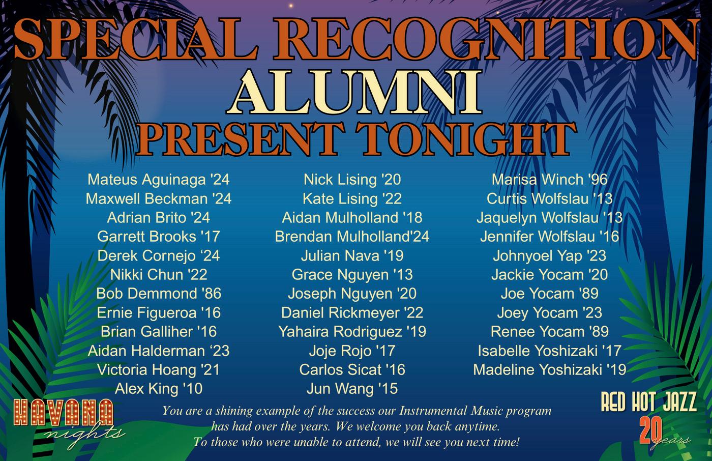 Red Hot Jazz has also become a powerful community event, with growing attendance and alumni participation. At the 20th anniversary celebration this past spring, several alumni (see list on right) returned and even performed again on stage which created a meaningful, full-circle moment.
