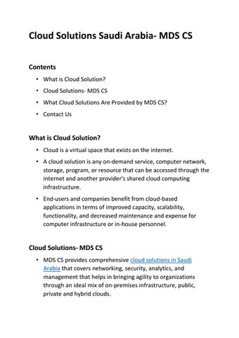 Cloud Solutions Saudi Arabia- MDS CS Contents • What is Cloud Solution? • Cloud Solutions- MDS CS • What Cloud Solutions Are Provided by MDS CS? • Contact Us