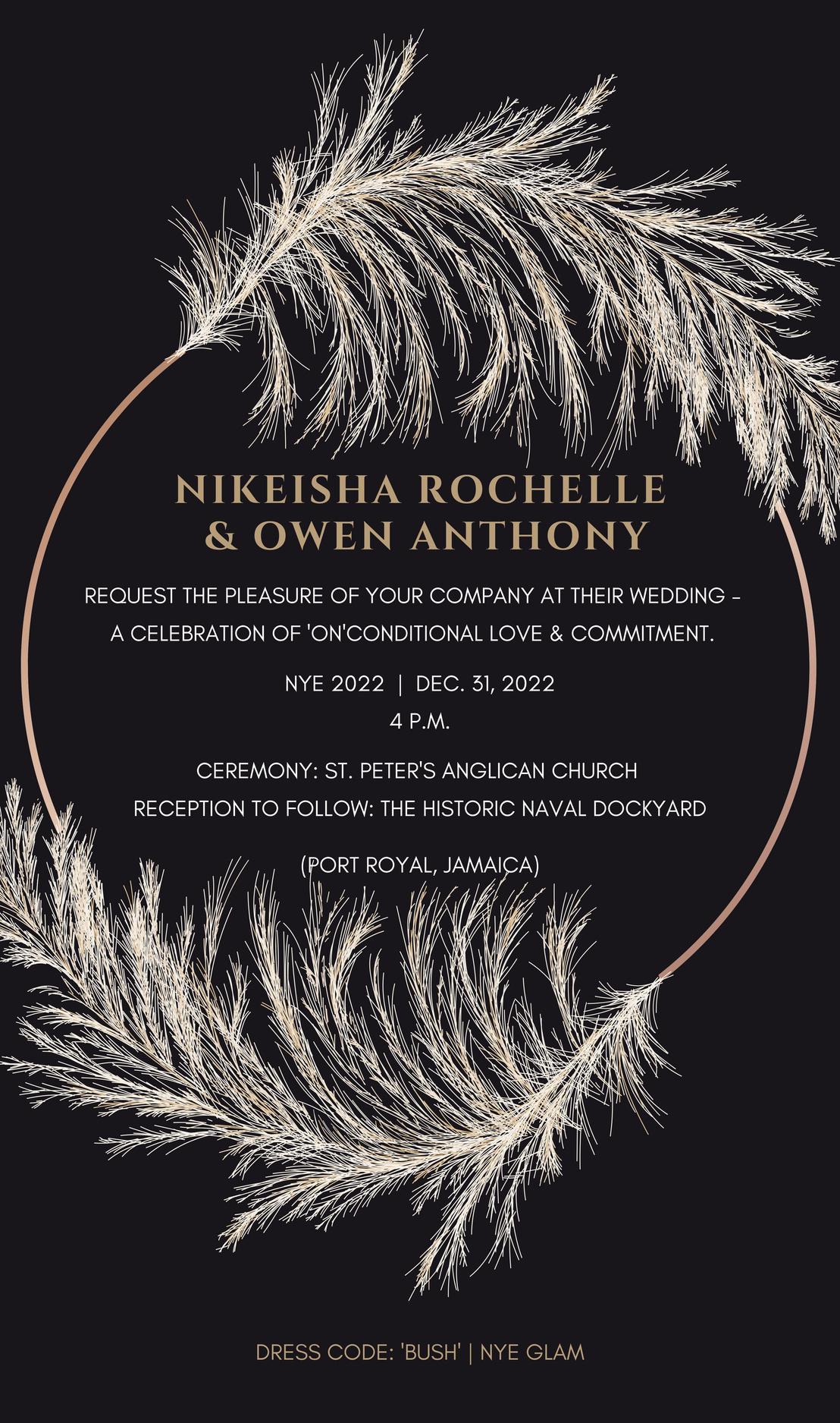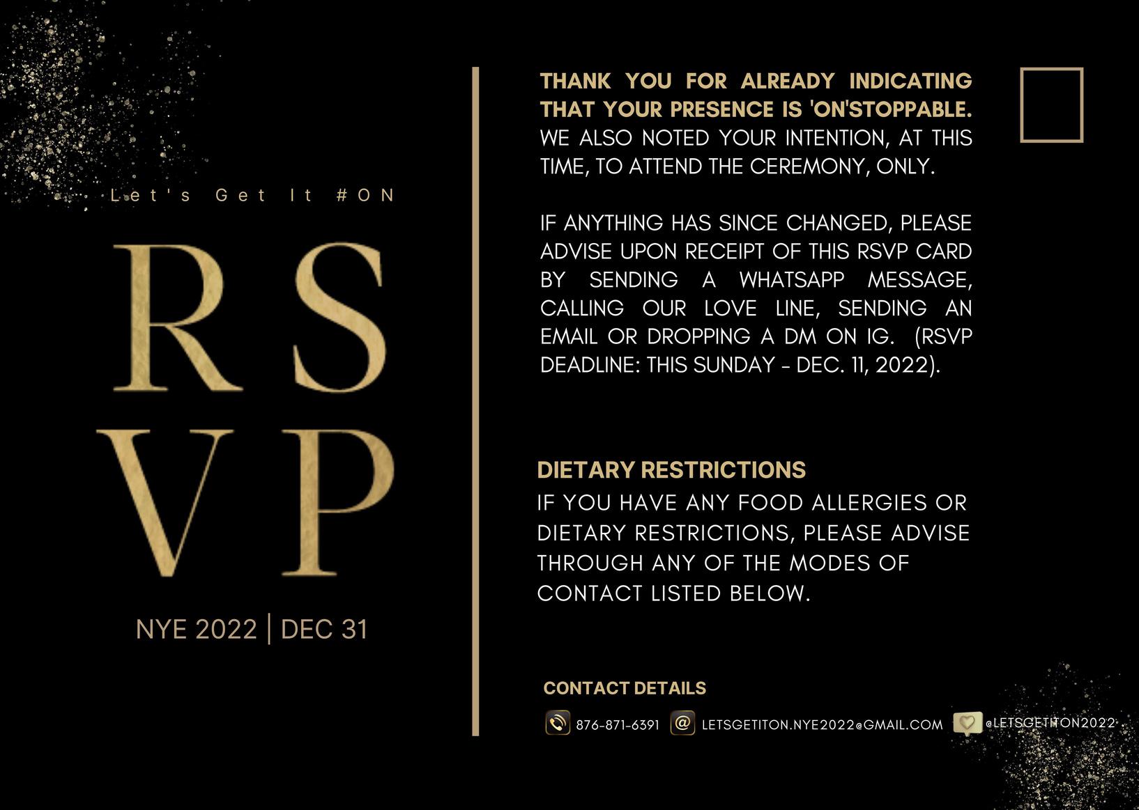 RING-ING IN NYE 2022 A delicate choice in date but carefully chosen and personally significant Get in the countdown spirit with a wardrobe choice that makes you look & feel amazing! @LetsGetItOn.NYE2022 SPECIAL INVITATION EDITION LETS GET IT #ON 'ON' TIME WAGERS Will the bride & groom get to the altar in the 'nik' of time? Place your bets! BRING IT 'ON'! GETTING 'ON'DRESSED Let'sGetIt#ON PORT ROYAL Close to the site the fireworks officially beganSpot 'ON' in making history again LetsGetItOn NYE2022@gmail com 876-871-6391