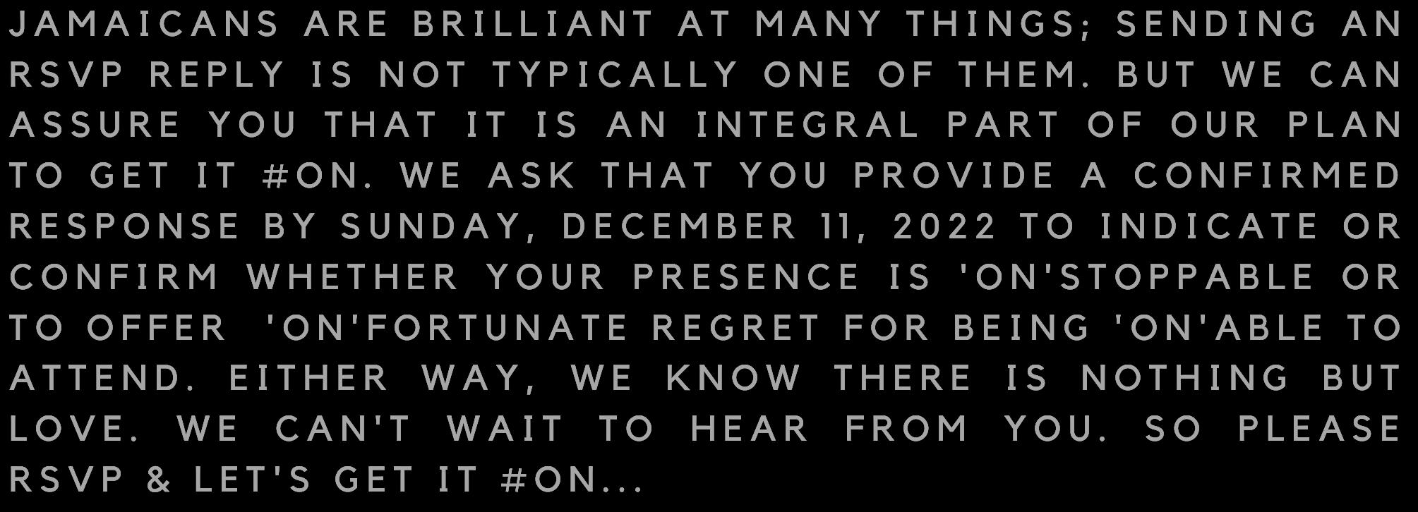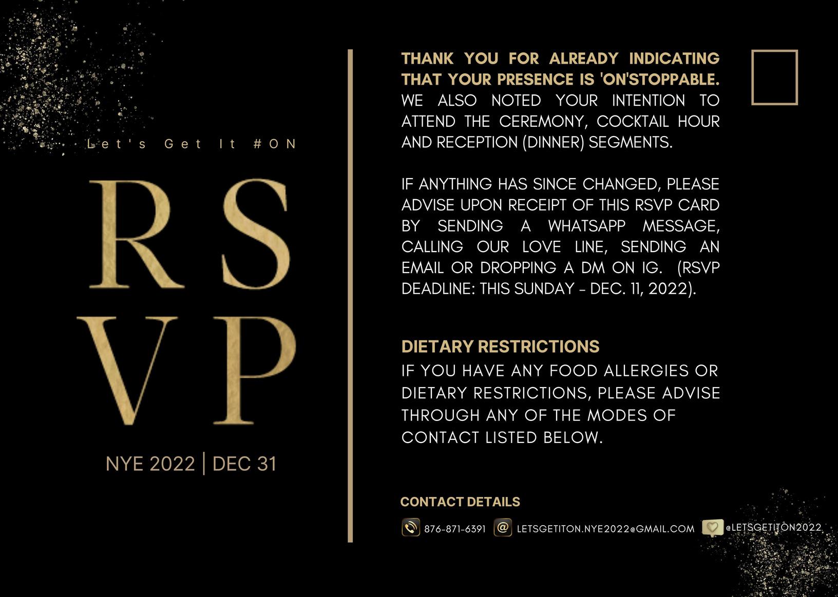RING-ING IN NYE 2022 A delicate choice in date but carefully chosen and personally significant Get in the countdown spirit with a wardrobe choice that makes you look & feel amazing! @LetsGetItOn.NYE2022 SPECIAL INVITATION EDITION LETS GET IT #ON 'ON' TIME WAGERS Will the bride & groom get to the altar in the 'nik' of time? Place your bets! BRING IT 'ON'! GETTING 'ON'DRESSED Let'sGetIt#ON PORT ROYAL Close to the site the fireworks officially beganSpot 'ON' in making history again LetsGetItOn NYE2022@gmail com 876-871-6391