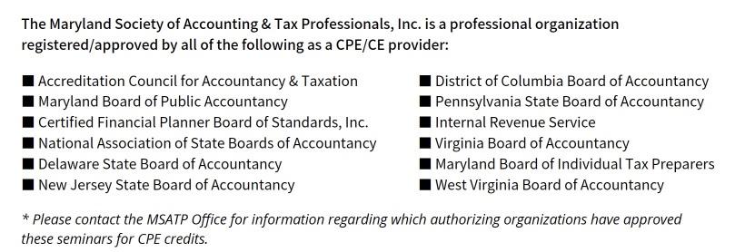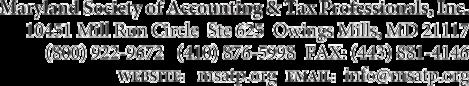 Maryland Society of Accounting & Tax Professionals is registered with the National Association of State Boards of Accountancy (NASBA) as a sponsor of continuing professional education on the National Registry of CPE Sponsors. State boards of accountancy have nal authority on the acceptance of individual courses for CPE credit. Complaints regarding registered sponsors may be submitted to the National Registry of CPE Sponsors through its website: www.nasbaregistry.org.