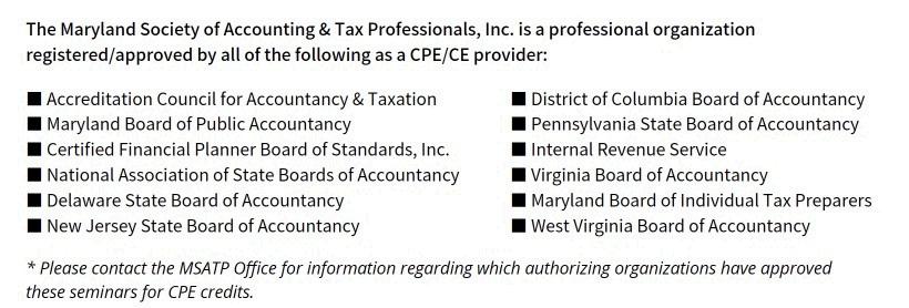 As we begin our 66th year, the Maryland Society of Accounting & Tax Professionals continues to take pride in serving the continuing education needs of over 4,000 professionals in Maryland and beyond Whether you are a CPA, EA, Maryland Tax Preparer, bookkeeper, or CFP®, we recognize that you have many options from which to receive the latest education, and we cherish your unwavering commitment to MSATP Likewise, we remain committed to providing timely, relevant education for all our member and non-member attendees I am thrilled to announce a new partnership this year and inform you of some key changes in our in-person seminars