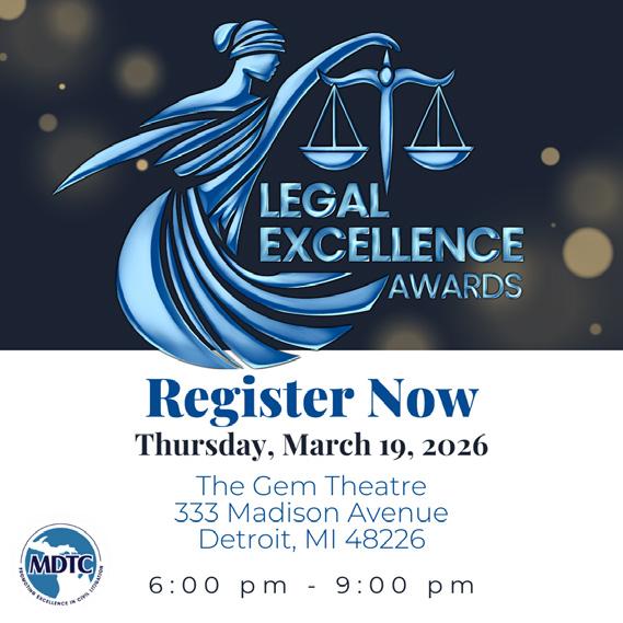 I warmly invite all of our MDTC members, colleagues, and friends to join us in honoring these remarkable individuals. The 10th Annual Legal Excellence Awards event on March 19, 2026 promises to be an inspiring evening. Come out to the Gem Theatre in Detroit and be a part of this celebration. Let’s gather as a community to applaud our honorees, learn from their examples, and reaffirm our shared commitment to excellence in the defense of our clients and the rule of law. I encourage you to attend, not just to support the award recipients, but to reconnect with fellow professionals and reignite the passion for what we do. Together, we will celebrate the very best of Michigan’s legal profession and look ahead to the future we will build on the strong foundation these honorees have laid. I hope to see you there – let’s celebrate this decade of excellence and chart the course