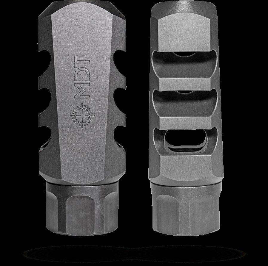 The flat 5” surface aids in linear recoil and the rounded profile reduces snagging on bags and gear. Bolt-on and M-LOK options available.