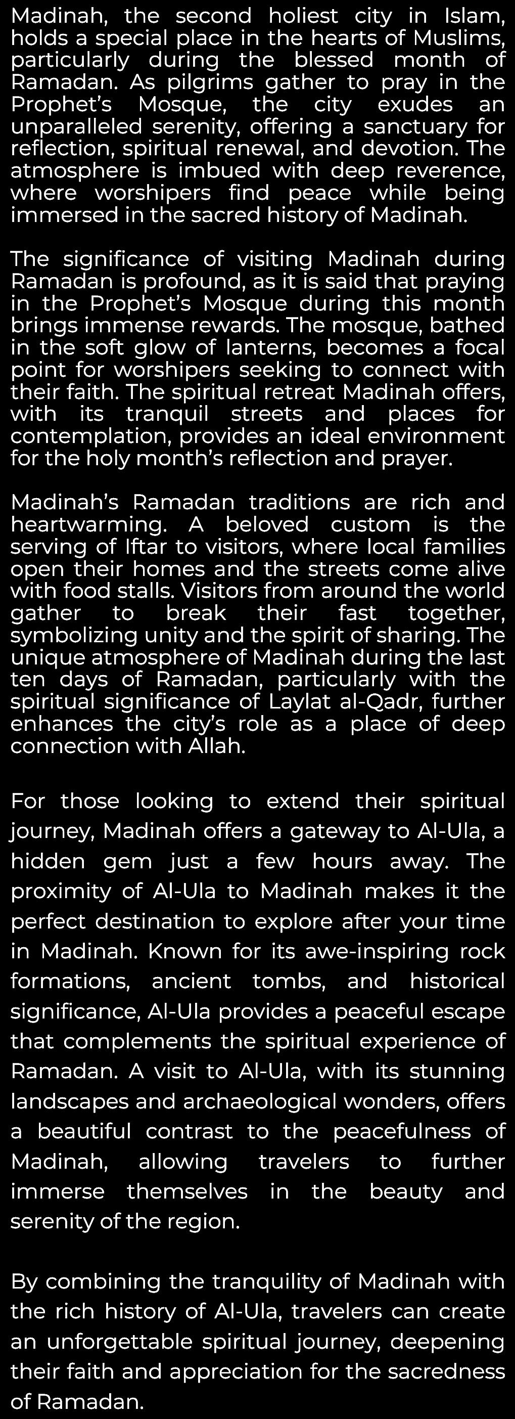 lUla is best known for its otherworldly desert landscapes and awe-inspiring rock formations These stunning natural sights make it the perfect place for reflection and connection with both nature and the divine During Ramadan, the quiet serenity of AlUla is heightened, offering an ideal setting to break away from the busyness of everyday life and find peace As the sun sets and the desert sky becomes a blanket of stars, the tranquil atmosphere of AlUla transforms into something magical The experience of fasting in the midst of such beauty is truly unparalleled, and for many, it’s an opportunity to reflect on the blessings of the month Whether you’re enjoying a peaceful Iftar under the stars or engaging in quiet contemplation at one of the many scenic viewpoints, AlUla’s landscapes offer the perfect backdrop for a spiritually fulfilling Ramadan