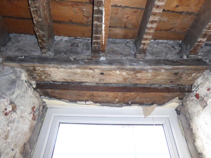 • Floor – The entire existing timber floor construction was replaced with new north-south-spanning joists being built into pockets in the north and south walls. Before the original joists were removed it was noted that softwood noggins had been introduced to stiffen the floor construction, presumably for a new use. It was also noted that trimming to the east chimney breast suggested that the original chimney breast was much-larger than the replacement chimney breast.