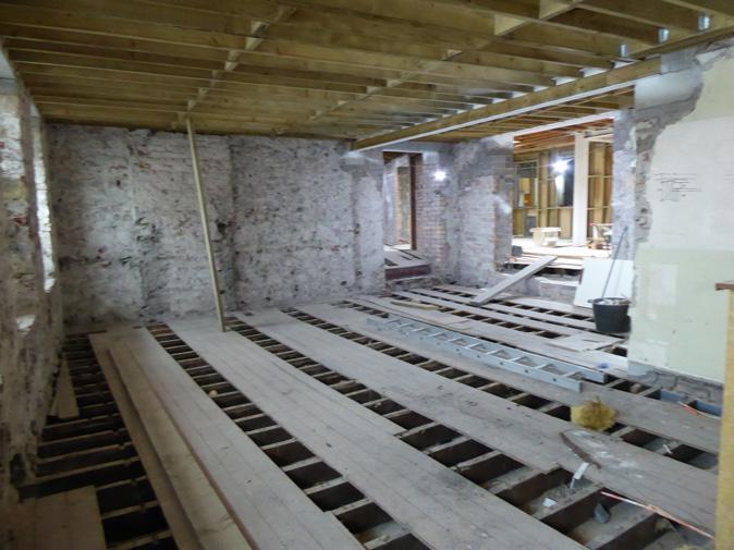 • Floor – It is probable that the first floor construction, comprising timber floor boards laid on north-south spanning timber joists was introduced when the building was remodelled in 1907. The THI Project retained the joists but floor boards were replaced with plywood sheeting.