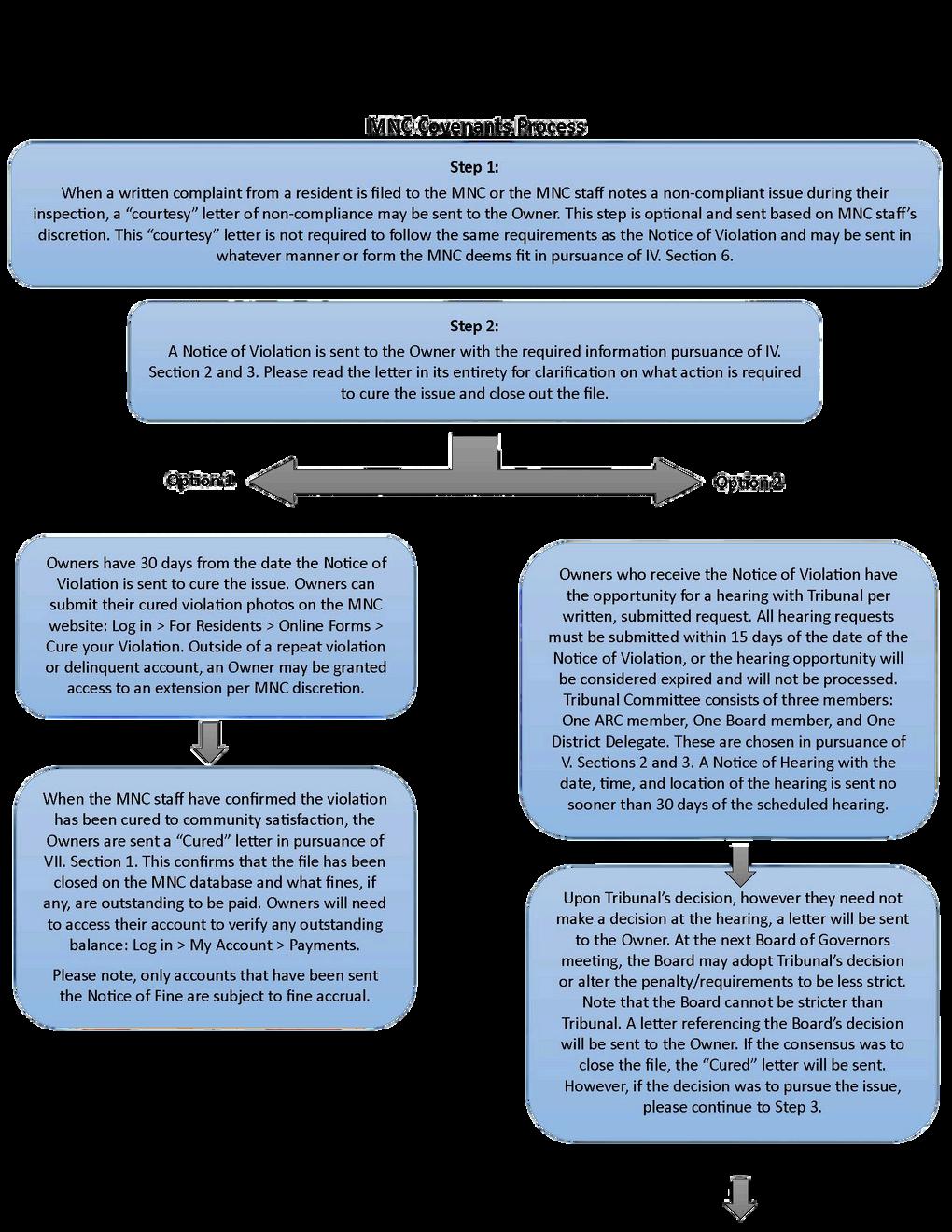 This process is a paraphrased description of the Covenant Enforcement Procedure Policy and the Collections Policy. All related documents, including the below process, are readily available for download, print, and future reference on our website under Covenants Information (owner login required)