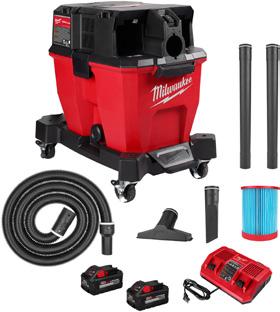 Delivers up to 45 CFM and 42” of suction | Stores neatly in a van or cart | On-board storage for attachments | Comes with a wall mount hanging plate | Includes Crevice Tool, 5’ Flexible Hose, HEPA Filter, Utility Nozzle, Wall Mount MWK0960-20 M12 FUEL 1.6 Gal Wet/Dry Vacuum