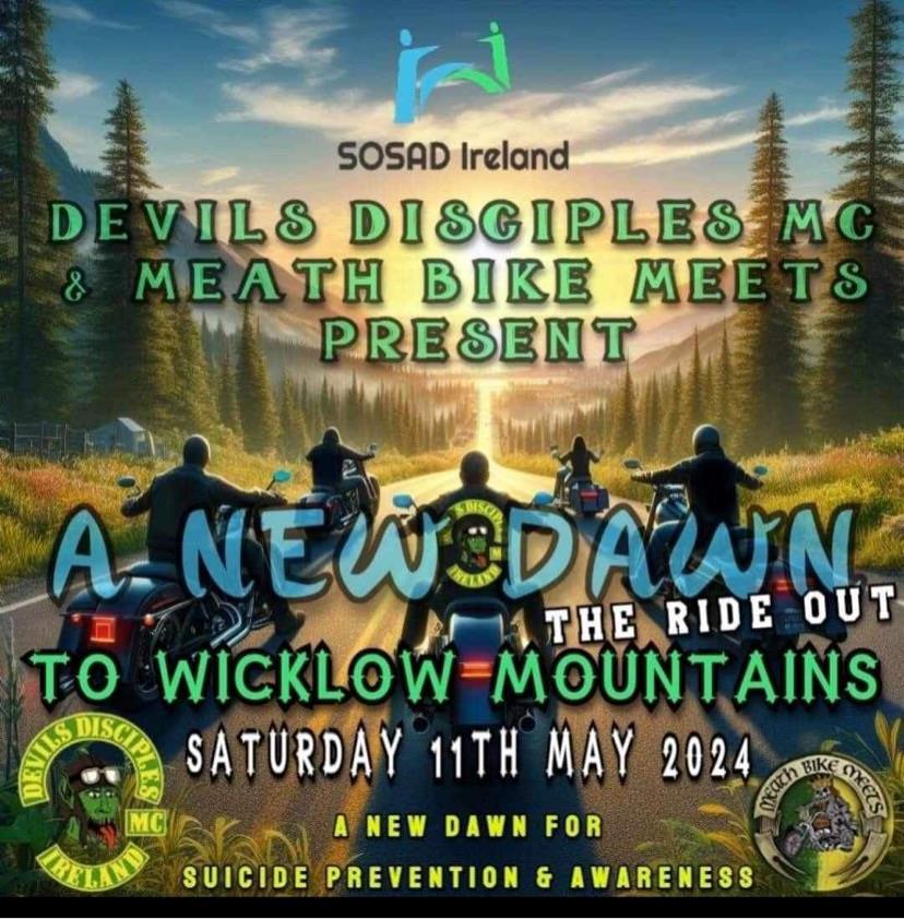 Organizers from Devils Disciples MC & Meath Bike Meets have said we have teamed up with Sosad Ireland and want to do something to highlight the problem of suicide within our community by taking our bikes through the towns & villages of Ireland and into Wicklow stopping at Turlough Hill carpark where we will welcome “ A New Dawn” as the sun rises over the Wicklow mountains”