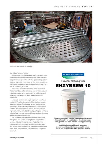 filter failure/reduced output. Onsite training can be provided during the service visit to ensure that correct maintenance and usage continue long after the engineer has left. The specialist equipment required to provide a complete service of the candles, as used by the engineer, is also available for purchase - as well as full training in its use. Stella-Meta understands that not every business is the same and can tailor its training and servicing around individual requirements, production schedules, annual volumetric throughput or public liability insurance inspections. Among its customers to enjoy significant benefits as a result of Metafilter servicing is Britain’s oldest brewer, Shepherd Neame. The filtration service performed by Stella-Meta at the company’s brewery at Faversham in Kent has delivered sparkling results, showing a major improvement in production throughput. Regular servicing will also help maintain beer and filtrate quality and reduce unplanned maintenance costs. "We have seen a major improvement in production throughput, and it won’t be long before we enlist the services of Stella-Meta once more. Aside from the improvement in throughput, servicing maintains beer and filtrate quality, and reduces unplanned maintenance costs,” says Jean Timmons, senior brewer at Shepherd Neame. u