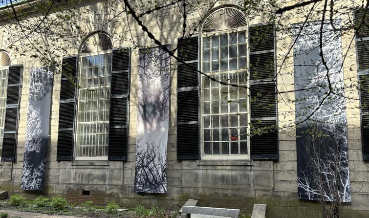 created an activation outside of the Church using her own photographs printed on fabric hung against the walls outside. The activation included audio which was sourced from old video recordings she found while digitizing files for her mom. “I found a video of [my mom] interviewing Penobscot and Passamaquoddy children from the ’90s, and these kids had such profound things to say and talked about being Wabanaki and what culture means to them, and what [their] struggles are. And I used that along with some chants as an audio piece that went with the fabrication.”
