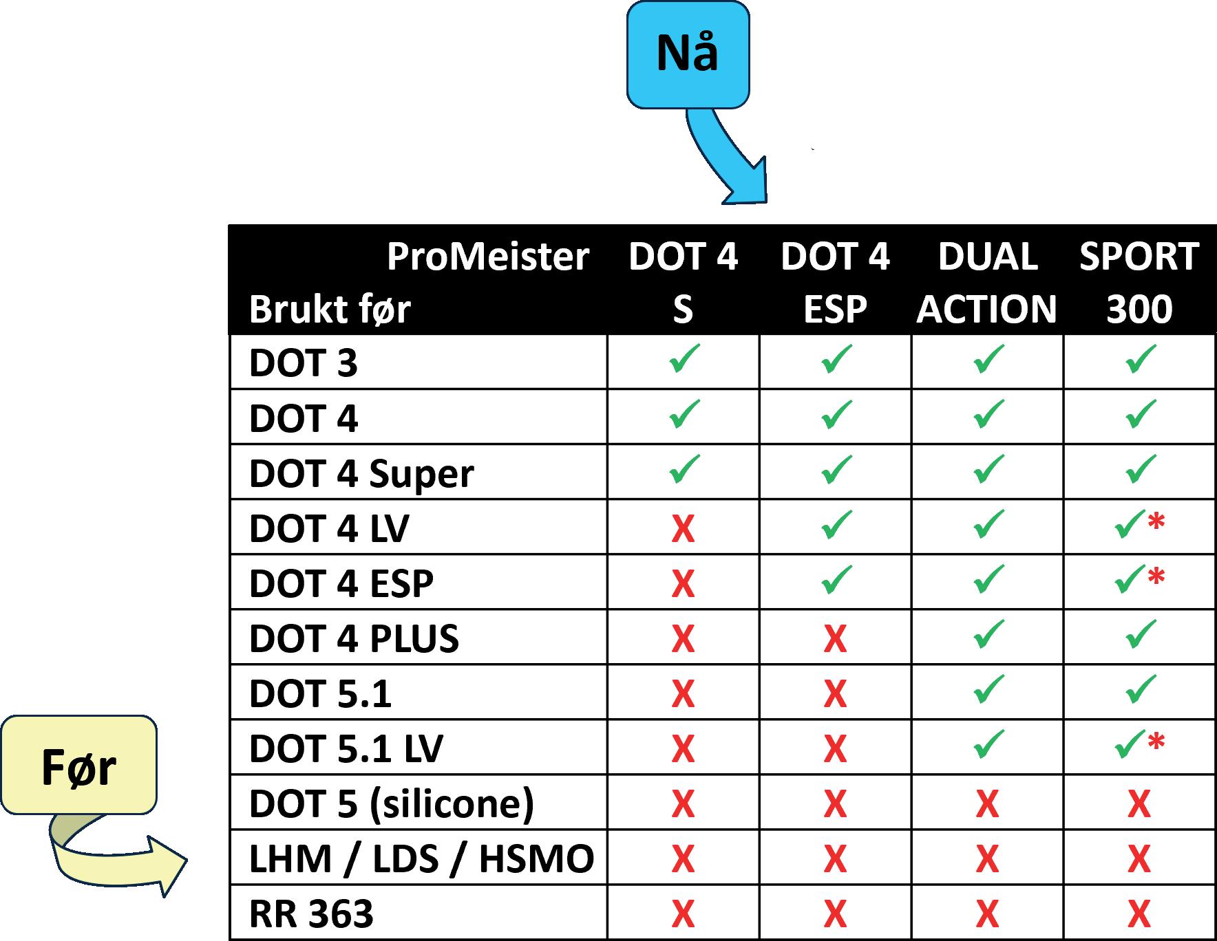 Finn overgang fra “gammel”/OEM anbefaling til ny ProMeister bremsevæske i tabellen.