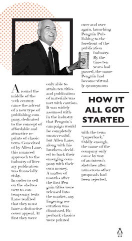 round the middle of the 20th century came the advent of a new type of publishing company, dedicated to the concept of affordable and attractive reprints of classic texts. Conceived of by Allen Lane, this nuanced approach to the industry of literary publication was financially risky. In order to sell on the shelves next to contemporary texts Lane realized that they must have a distinctive cover appeal. At first they were