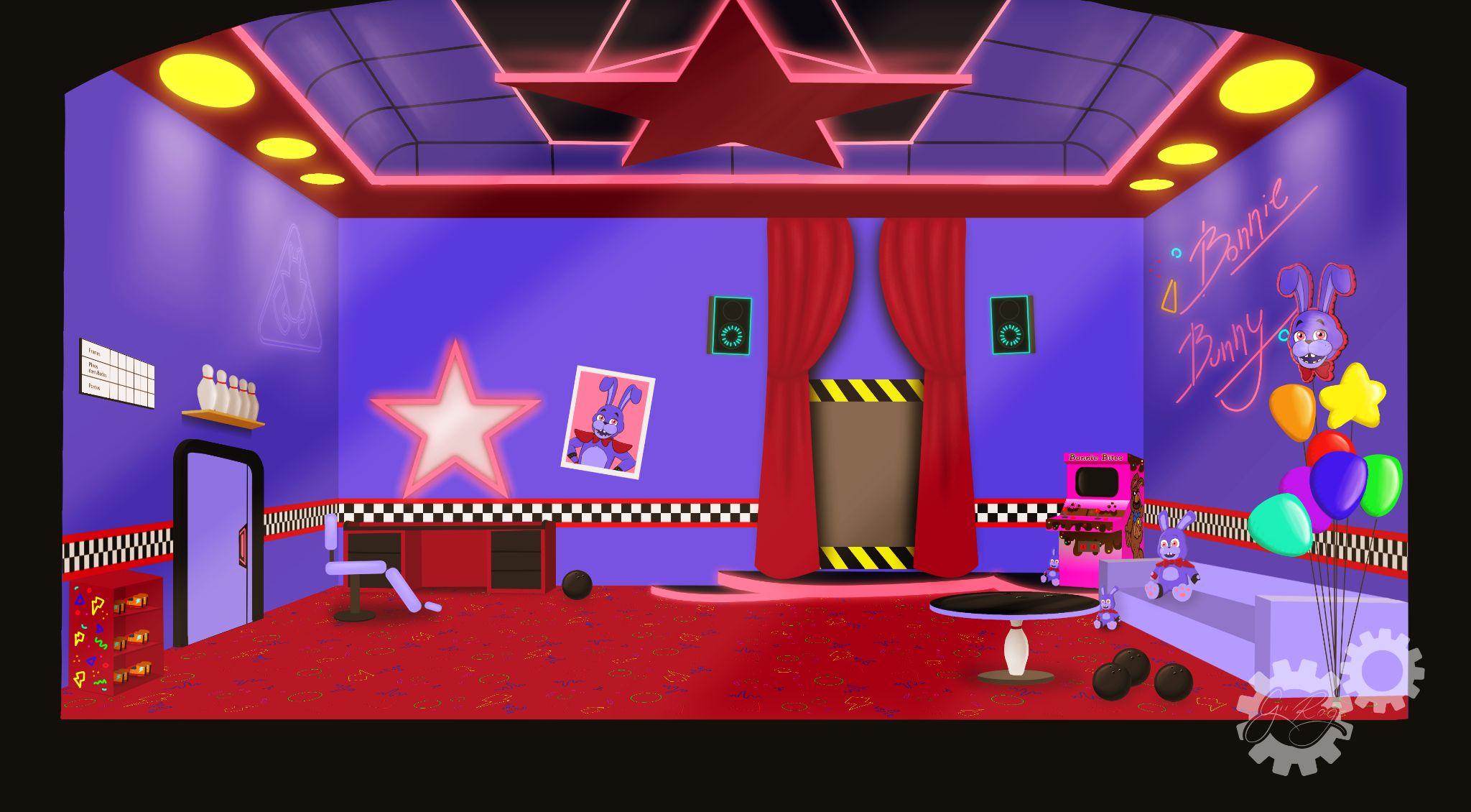 The photo room was imagined using the other four as a reference, inserting all the objects present in all the rooms (such as the arcade cabinet, neon signs and dressing tables) and adding the elements referring to the animatronic in question (plush, balloon and bowling balls).