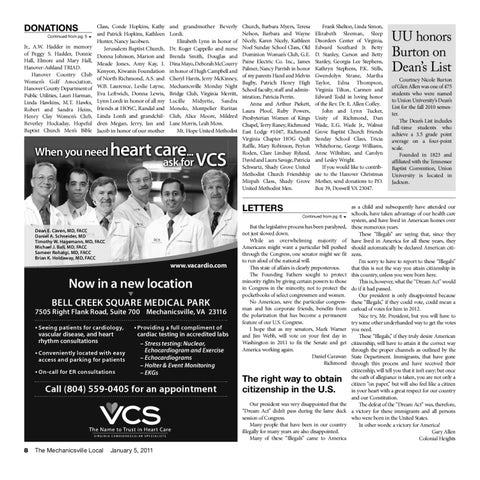 as a child and subsequently have attended our schools, have taken advantage of our health care system, and have lived in American homes over these numerous years. These “Illegals� are saying that, since they have lived in America for all these years, they should automatically be declared American citizens. I’m sorry to have to report to these “Illegals� that this is not the way you attain citizenship in this country, unless you were born here. This is, however, what the “Dream Act� would do if it had passed. Our president is only disappointed because these “Illegals,� if they could vote, could mean a carload of votes for him in 2012. Nice try, Mr. President, but you will have to try some other underhanded way to get the votes you need. These “Illegals,� if they truly desire American citizenship, will have to attain it the correct way through the proper channels as outlined by the State Department. Immigrants, that have gone through this process and have received their citizenship, will tell you that it isn’t easy; but once the oath of allegiance is taken, you are not only a citizen “on paper,� but will also feel like a citizen in your heart with a great respect for our country and our Constitution. The defeat of the “Dream Act� was, therefore, a victory for these immigrants and all persons who were born in the United States. In other words: a victory for America! Gary Allen Colonial Heights