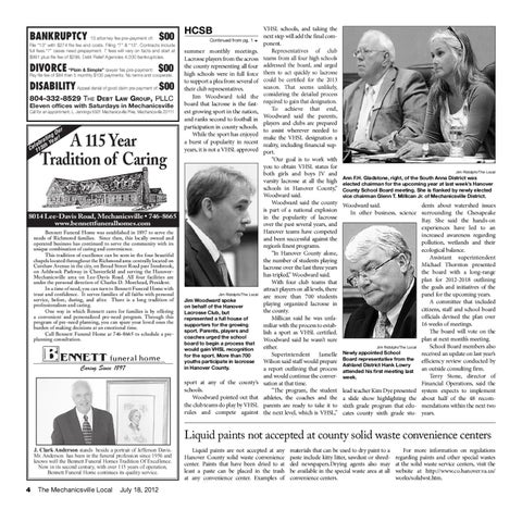 dents about watershed issues Woodward said. In other business, science surrounding the Chesapeake Bay. She said the hands-on experiences have led to an increased awareness regarding pollution, wetlands and their ecological balance. Assistant superintendent Michael Thornton presented the board with a long-range plan for 2012-2018 outlining the goals and initiatives of the panel for the upcoming years. A committee that included citizens, staff and school board officials devised the plan over 16 weeks of meetings. The board will vote on the plan at next month’s meeting. School Board members also Jim Ridolphi/The Local Newly appointed School received an update on last year’s Board representative from the efficiency review conducted by Ashland District Hank Lowry an outside consulting firm. attended his first meeting last Terry Stone, director of week. Financial Operations, said the lead teacher Kim Dye presented system expects to implement a slide show highlighting the about half of the 48 recomsixth grade program that edu- mendations within the next two cates county sixth grade stu- years.
