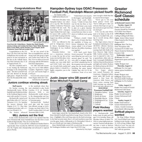 naïve enough to think that this is a top tier heavy league. “You’ve got to win your home games,” Favret said. “You’ve really got to take care of home then hope you get on the road and you get more than you don’t get.” H-SC was the only ODAC team to be listed on the D-III Preseason Football Poll, coming in second among others receiving votes. The Tigers return a host of local players including two-time All-ODAC offensive lineman, junior Ben Rogers and junior running back Kirk Rohle both from Hanover High School. Mills Godwin product Travis Lane is expected to take over at quarterback, while wide out Sean Cavanaugh (Midlothian), Anthony Mancini (Benedictine) and tight end Andrew Buckner (LC Bird) are back as All-ODAC selections from last season. Two league players were named Preseason AllAmericans. Hampden-Sydney senior safety Bill Doody was named a First Team AllAmerican while Emory and Henry senior running back Caleb Jennings was named to the second team offensive unit.