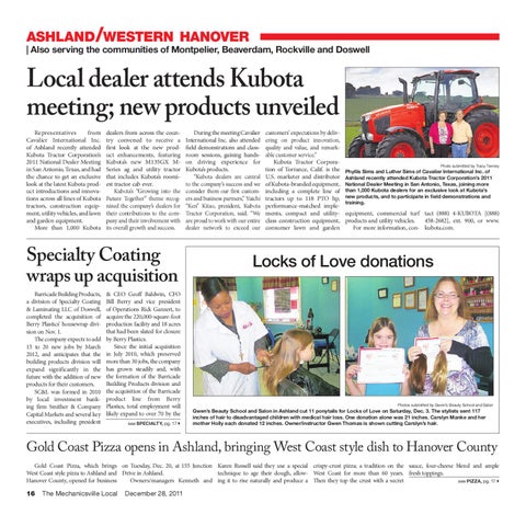 Local dealer attends Kubota meeting; new products unveiled Representatives from Cavalier International Inc. of Ashland recently attended Kubota Tractor Corporation’s 2011 National Dealer Meeting in San Antonio, Texas, and had the chance to get an exclusive look at the latest Kubota product introductions and innovations across all lines of Kubota tractors, construction equipment, utility vehicles, and lawn and garden equipment. More than 1,000 Kubota