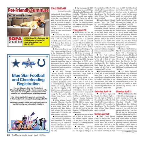 Friday, April 18 Reservations are due for FANFest 2014 Golf Tourney & Bash, which will be held on April 24 and 25 at Hanover Country Club in Ashland. Lunch will be from 11:30 a.m. to 1 p.m. Tee-off will begin at 1 p.m. The Bash will be held on April 25 from 7 to 11 p.m. The local celebrity guest emcee will be Bill Bevins. Live music will be provided by Double Clutch. Dinner will provided by Buz and Ned’s Real BBQ. For more information, to RSVP or to make a donation, visit the website, www.andrewsfanfest2014. com on the Golf Tourney contact Ryan Hudson at ryanhudson@comcast.net and for the Bash contact Caryn Martin at 5-martins@comcast.net. Spring Break at the Library: Re-Leaf will be held from 10 a.m. to noon at the Hanover Branch Library. For all ages. Learn about trees and their importance in a healthy environment. Space is limited– reservations are required. Children must be accompanied by an adult. Contact the Hanover County Extension Office, lynnj67@vt.edu, or 804-752-4310 to reserve your 30 min. slot. Presented by the Hanover Master Gardeners. Call 804-365-6210 or visit the library at 7527 Library Drive for information. Family Storytime, all ages, will be held at 10:45 a.m. at the Hanover Branch Library. Call 804-365-6210 or visit the library at 7527 Library Drive for more information. All Souls Episcopal Church Good Friday service will begin at 5:30 p.m. at
