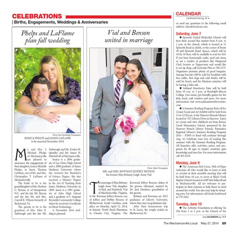 Saturday, June 7 Epworth United Methodist Church will host their second flea market from 8 a.m. to 1 p.m. at the church, which is located at 11 Epworth Road in Aylett, or the corner of Route 30 and Epworth Road. Spaces, which will be 10-by-10-foot, will be available to rent for $10. If you have homemade crafts, yard sale items or are a vendor of products like Pampered Chef, Scentsy or Tupperware and would like to set up shop, call Gertrude Pitts at 769-2175. Organizers promise plenty of good bargains. Sausage biscuits will be sold for breakfast with free coffee. Hot dogs and cold drinks will be sold for lunch, and the Missions ministry will be having a bake sale. Ashland Strawberry Faire will be held from 10 a.m. to 5 p.m. at Randolph-Macon College. Live music, pet friendly, games for the kids, food, craft vendors and more. For more information visit www.ashlandstrawberryfaire. com. A Summer Reading Program Kick-off Ice Cream Social and Art Exhibit will be held from 11 to 12:30 p.m. at the Hanover Branch Library located at 7527 Library Drive in Hanover. Enjoy ice cream and view children’s art from Kersey Creek Elementary School, sponsored by the Hanover Branch Library Friends. Pamunkey Regional Library’s Summer Reading Program 2014 – PAWS to Read will continue through Aug. 16. Celebrate your love of reading this summer with the Summer Reading Program. All branches offer activities, prizes and programs for all ages to inspire creativity, gain knowledge and have fun. For more information call 365-6210.