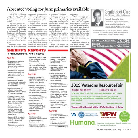 Absentee voting for June primaries available HANOVER – Absentee voting for the June 11 Republican and Democratic Party primary elections is available. Only the qualified voters registered in the 12th Senate District, Beaverdam, Chickahominy, Cold Harbor or Mechanicsville Magisterial Districts may vote absentee inperson at the voter registration office in the Wickham Building at 7497 County Complex Rd. in Hanover or vote absentee by mail. Registered voters must meet one of the 20 eligibility
