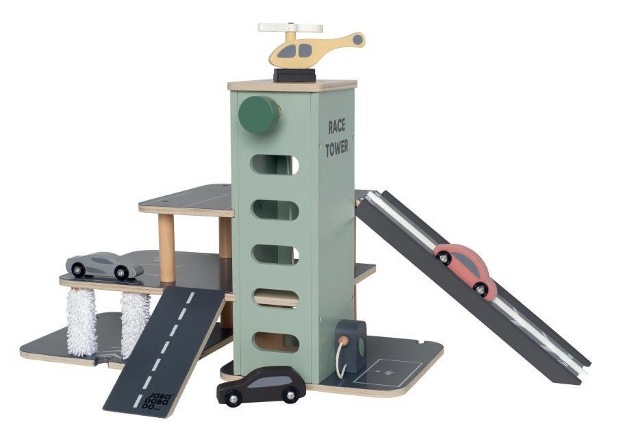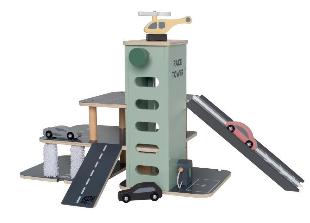 Parkeringsgarage. I trä. Med helikopter, bilar, hiss m.m. Från 2 år.