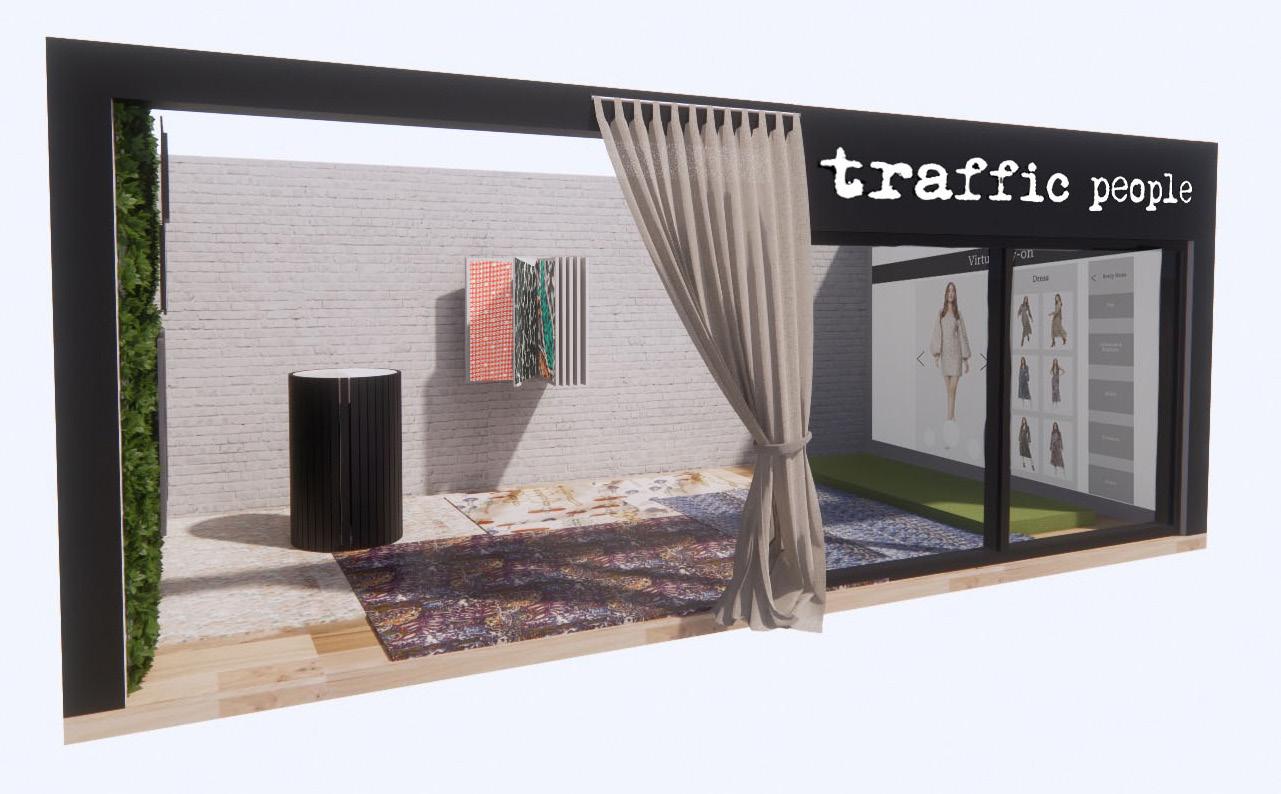 Traffic People is an online clothing company with a passion for sustainability. The goal of this project was to create three different tradeshow booths that represents Traffic People. We accomplished this through incoporating the unique Traffic People patterns and fabrics throughout the design. We also wanted visitors to have an interactive experience with our virtual try-on screen, fabric flip books and social areas to allow for business to business relationships to be built.