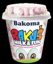Oprócz drażetek będzie teraz można skosztować mięciutkich pianek typu marshmallow. Bakuś Milk&Fun to nie tylko zdrowa mleczna przekąska dla dzieci ale również moc zabawy dzięki drażetkom i piankom z topera. Dzięki nim rodzice mogą zachęcić dzieci do jedzenia produktów mlecznych, które są źródłem wapnia. Jogurt waniliowy