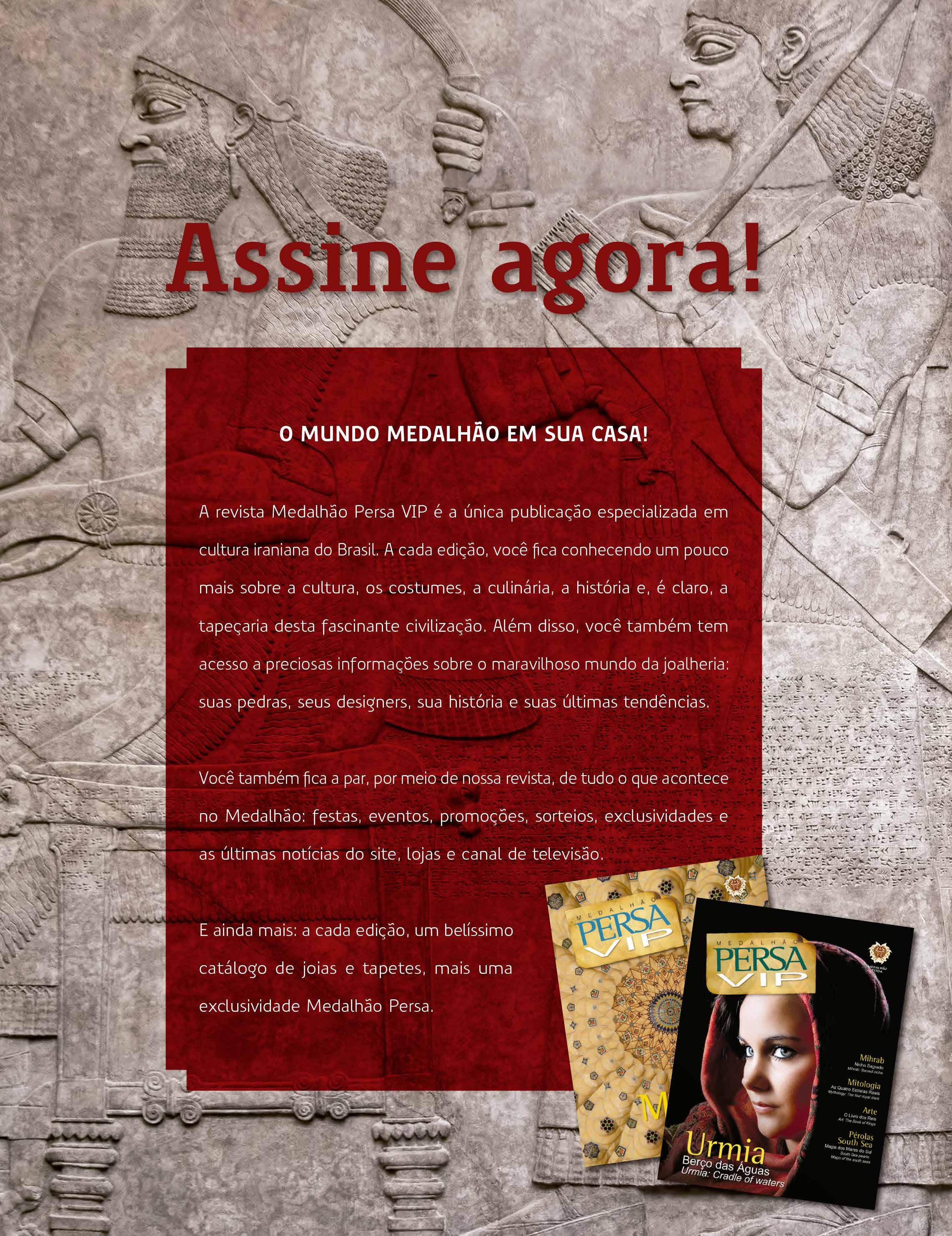 VIP e receba em casa, com todo o conforto, 12 exemplares que trarão tudo sobre o mundo persa, o Irã, atualidades, curiosidades, festas e eventos do Medalhão Persa, além dos belíssimos catálogos de joias e tapeçaria persa com as novidades do Medalhão