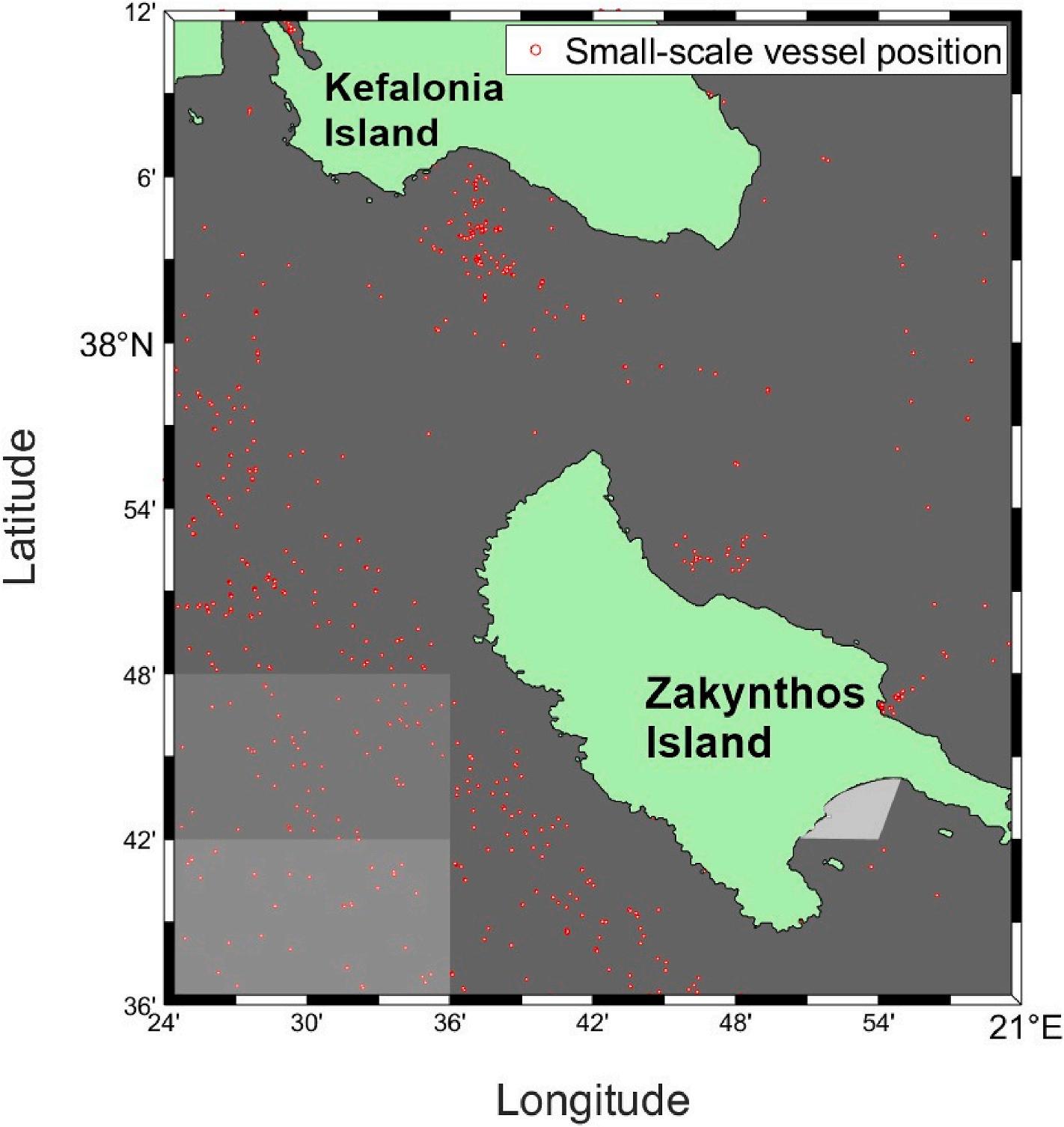 Existing methodologies for identifying fishing fields include analyzing VMS (Vessel Monitoring System) data, Automatic Identification System (AIS) data, self-reporting, questionnaires, and onboard observer data (Yan et al., 2022; Wang et al., 2024; Mesquita et al., 2024; Maina et al., 2016, 2018; Hu et al., 2016; Ramírez et al., 2024; Precoda and Orphanides, 2024; Tzanatos et al., 2005; Moutopoulos et al., 2020). However, relying solely on VMS and AIS data has several limitations as to the accessibility and reliability of the data, and the fact that VMS is not required for all fishing vessels and fisheries, and especially not for small-scale fishing activities (vessels ≤12 m) (Wang et al., 2024; Thoya et al., 2021; Birchenough et al., 2021). On the other hand, the onboard observer and self-reporting methodologies are often determined to be biased and/or incomplete (Gilman et al., 2019; Tubbs and Berggren, 2024). Questionnaires have proven significant for estimating the fishing grounds, although the researchers should evaluate the responses to discriminate true from biased responses (Karris et al., 2013). The innovation of this work is the combination of satellite data (proven to be extremely reliable in detecting vessel occurrence (Santamaria et al., 2017; Paolo et al., 2024)), questionnaires for the fishing community of Zakynthos, and existing telemetry data for species occurrence in the identified fishing fields.
