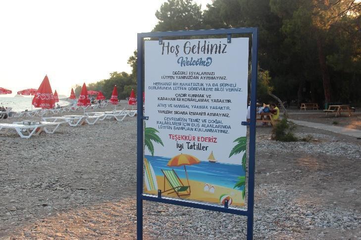 The public facility in Akmaz Beach lacks signs about sea turtles although signs were placed to prohibit camping, putting up tents, barbecuing, and building fires (Fig.7a, Fig.8). The old sign with text error at Lykia Botanika remains (Fig.76). This section of Yanıklar, along with Çalış B, needs more signs.