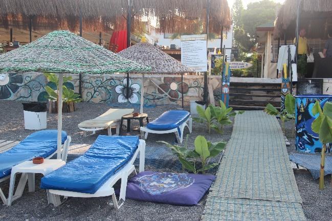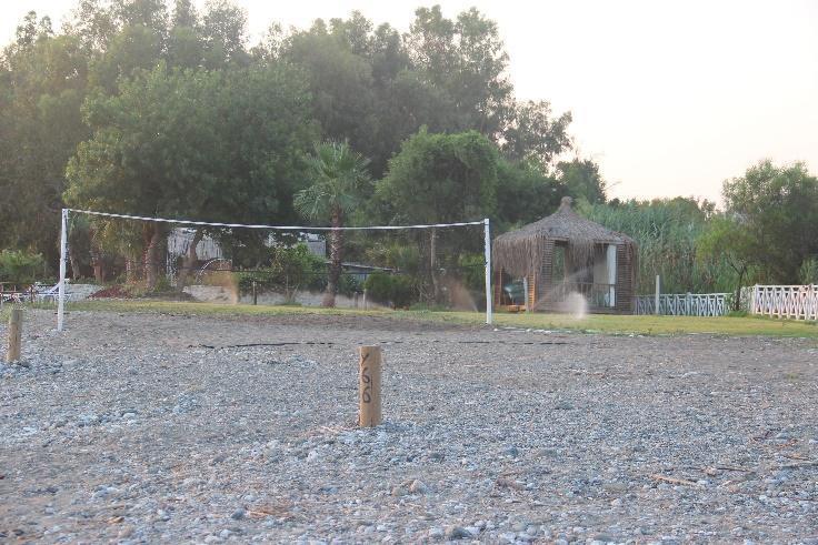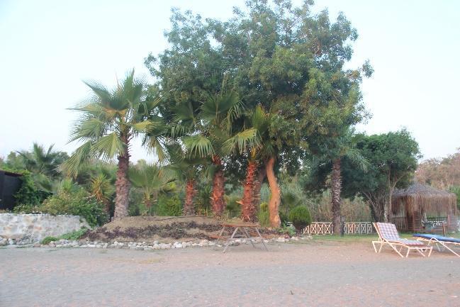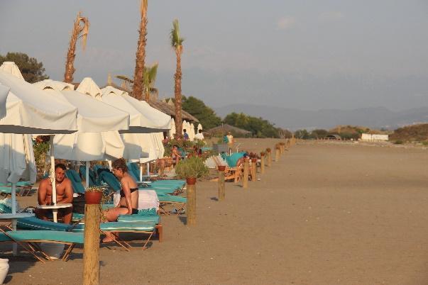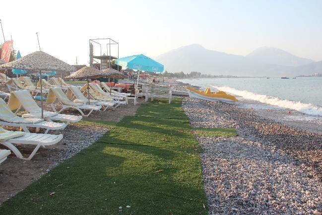 In Yanıklar, Karataş Beach and Deniz İncisi still keep the acacia plantations (Fig.5a c, Fig.26a b), and a newly planted oleander was seen on the beach of Deniz İncisi (Fig.28). Hotels keep their artificial plantations of grass, acacia, and palms behind the zoning posts (Fig.29a, 29c, Fig.30c, Fig.33). Almost all camping facilities northward in Akmaz Beach have acacia trees (Fig.36a c, Fig.37a b, Fig.38a b, Fig.39, Fig.40a b). Lykia Botanika had a planted area of grass, palms and acacia on the beach, next to its volleyball court, and they are watering this lawn (Fig.9a c). Katrancı Hotel also had acacia plantations inside the nesting zone.